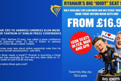 A Ryanair, famosa por seus voos de baixo custo, utilizou as redes sociais nesta terça-feira (20) para anunciar uma nova promoção: assentos destinados a “idiotas”, incluindo Elon Musk. A co...
